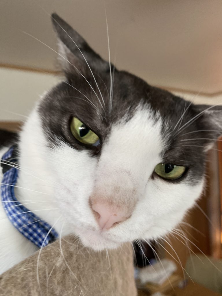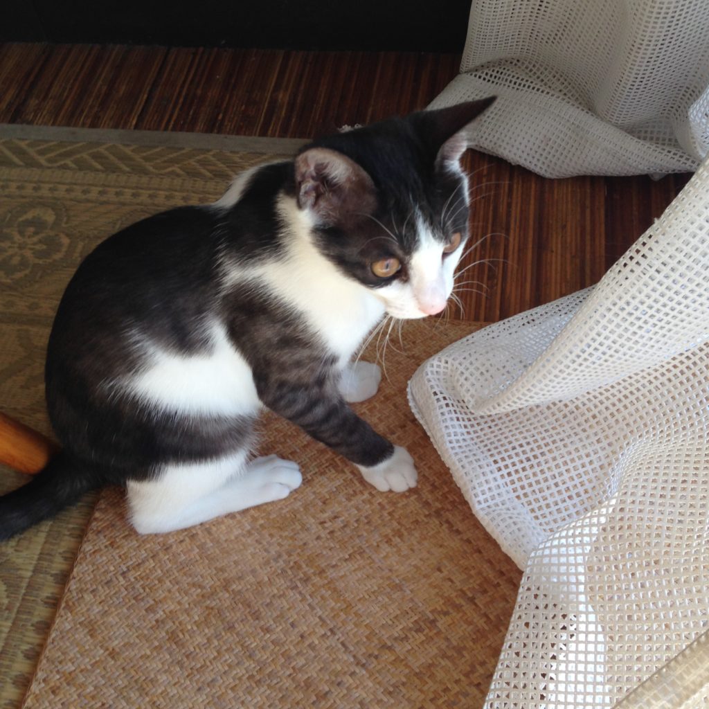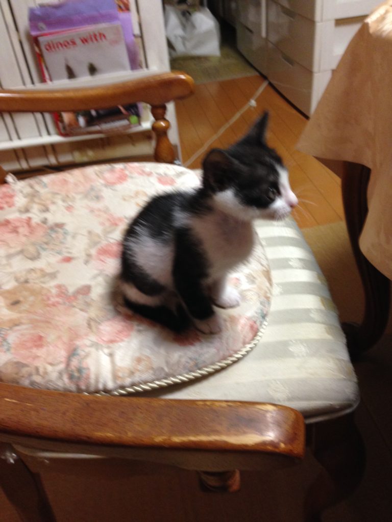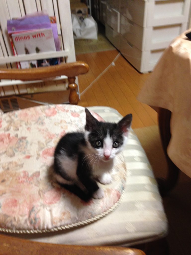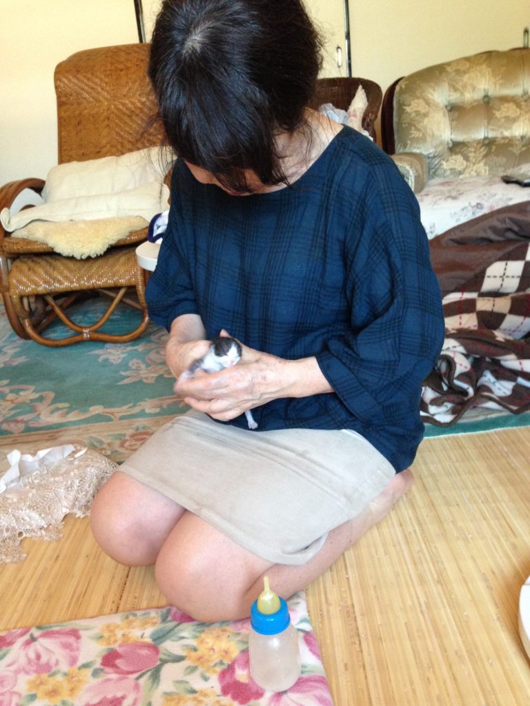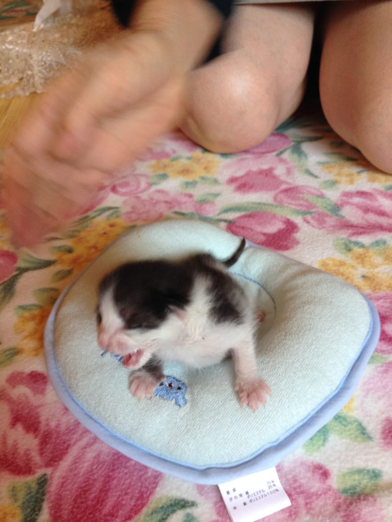 しばらくぶりに実家に妻と帰ってみると、物置の下から猫が飛び出して逃げてしまいました。その時は子猫をそこに生み落としているとは知らず、しばらくすると「ニャーニャー」と子猫の鳴き声が物置の下から聞こえ、飛び出したのは親猫だったと気づきました。親猫が戻ってくるのを2日待ちましたが、とうとう戻らないまま子猫の鳴き声も途切れていました。いずれ親猫が戻って来ることを願って、私たちが我が家に帰る準備をして車に乗ろうとすると、子猫が最後の力を振り絞ったかのように、大きい声で「ニャーニャーニャーニャー」と鳴きはじめました。親猫が戻ってこないことも気がかりだったので、物置の下から子猫をひっぱりだして我が家に一緒に車に乗せて連れて帰った子猫がミルです。